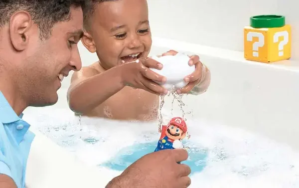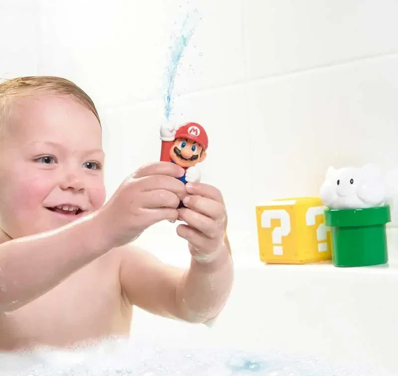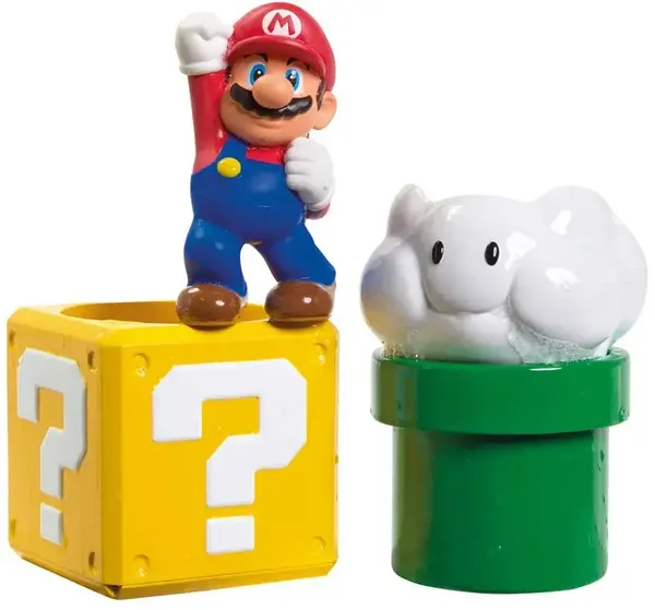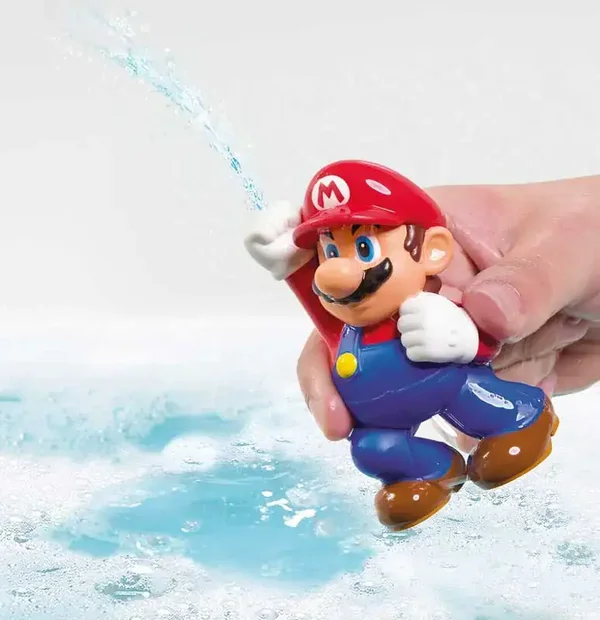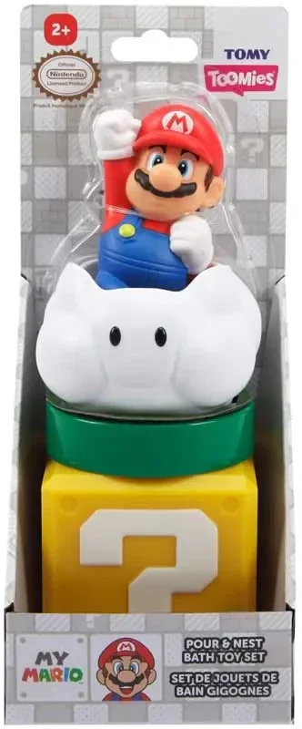 Breng de wereld van Mario tot leven met de Mario bad speeltjes giet en spuit! Maak van badderen een spetterend avontuur terwijl je kind samen met Mario en zijn vrienden eindeloos plezier beleeft. Stap, giet en spuit water met de Lakitu-wolk, de pijp, het vraagtekenblok en onze held, de Mario-spuit! Kijk hoe het water uit de Lakitu-wolk spuit, uit de pijp stroomt, het vraagtekenblok vult en erdoorheen stroomt en geef een ondeugende kneep met de Mario-spuit. Elk onderdeel heeft de perfecte maat voor kleine handjes, waardoor stapelen, in elkaar passen en gieten gemakkelijk en leuk is.